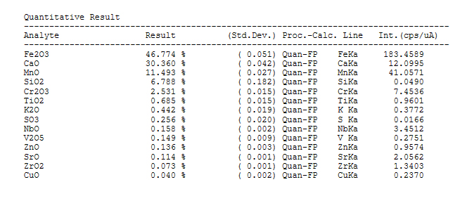 광석이나 토양, 슬래그와 같은 시료는 자연상태에서 오랜 시간을 걸쳐 서서히 산화되어 각 원소는 산화물 형태로 존재하게 됩니다. XRF는 시료에 포함된 원소의 함량을 분석한 후 각 원소 함량을 산화물의 함량으로 환산하는 방법이 가능합니다. 단, 모든 원소가 산화물 형태로 존재한다고 가정하며, 다른 화합물로 존재하는 경우 분석결과의 오차가 발생할 수 있습니다.