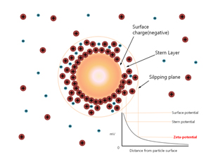 제타전위는 입자 사이에서 반발력이나 인력을 기반으로 양전하 밀도 차이에서 유래되는 전기역학적인 전위 차를 뜻합니다. 제타전위는 용액 내 입자의 분산 혹은 응집의 정도를 평가하는데 적용되며 제약, 의학, 화학 등 다양한 분야에 이용되는 분석입니다. 일반적으로 전위차의 절대값이 클수록 좋은 분산상태라고 평가하며 시료의 분산 메카니즘을 이해하는데 중요 요소입니다.