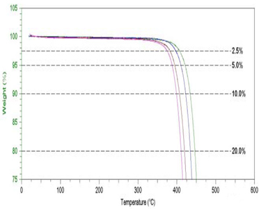 TGA를 이용하여 활성화에너지를 구하고 간이가속수명 graph로 간접적으로 수명을 예측해 볼 수 있습니다. 단, 열에 의한 분해에 의한 결과이기 때문에 다른 factor(수분, 산소, 바람 등)에 대해 포함이 되지 않기 때문에 실제의 가속수명과 차이가 있을 수 있습니다.